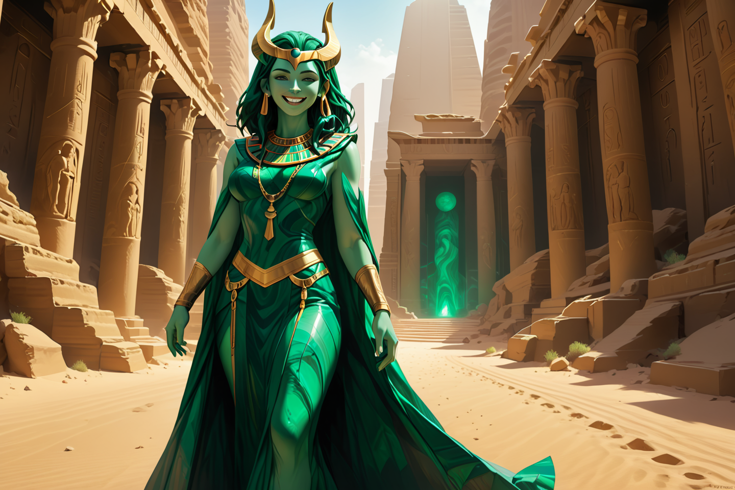 masterpiece, best quality, (ultra-detailed:1.3), (high resolution:1.2), (sharp focus:1.2), (clean lines:1.1), perfect anatomy, (intricate details:1.2), extremely detailed, realistic, style, a goddess, Loki, trickster god, with a mischievous grin, wearing green robes, tricking with a grin, solo, Egyptian sun temple with glowing obelisks, desert sun, detailed background, looking up, gazing at the sky, majestic, glowing aura, dynamic angle, wide shot, bright light, medium shot, <lora:Malachite_Style_SDXL:1>, malachite_style