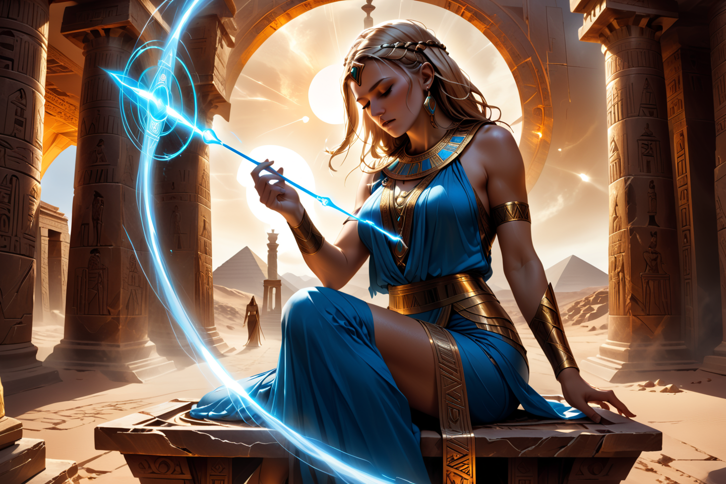 masterpiece, best quality, (ultra-detailed:1.3), (high resolution:1.2), (sharp focus:1.2), (clean lines:1.1), perfect anatomy, (intricate details:1.2), extremely detailed, realistic, style, a goddess, Frigga, goddess of marriage, with a spinning wheel, wearing blue robes, spinning with a wheel, solo, Egyptian sun temple with glowing obelisks, desert sun, detailed background, looking down, observing below, eternal, timeless presence, action focus, medium shot, ,, <lora:dvr-rst:1>, dvr-rst