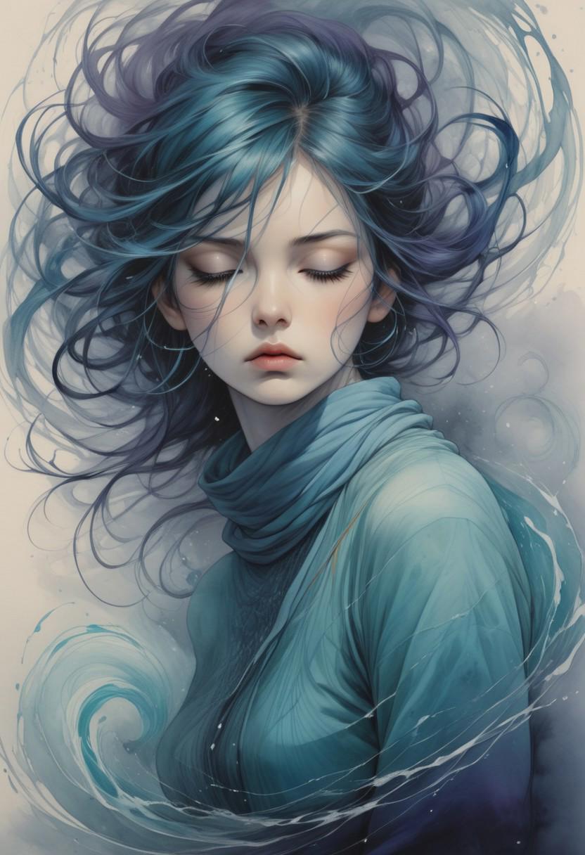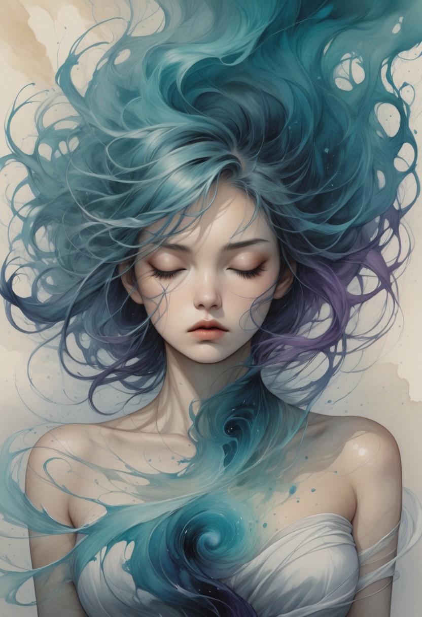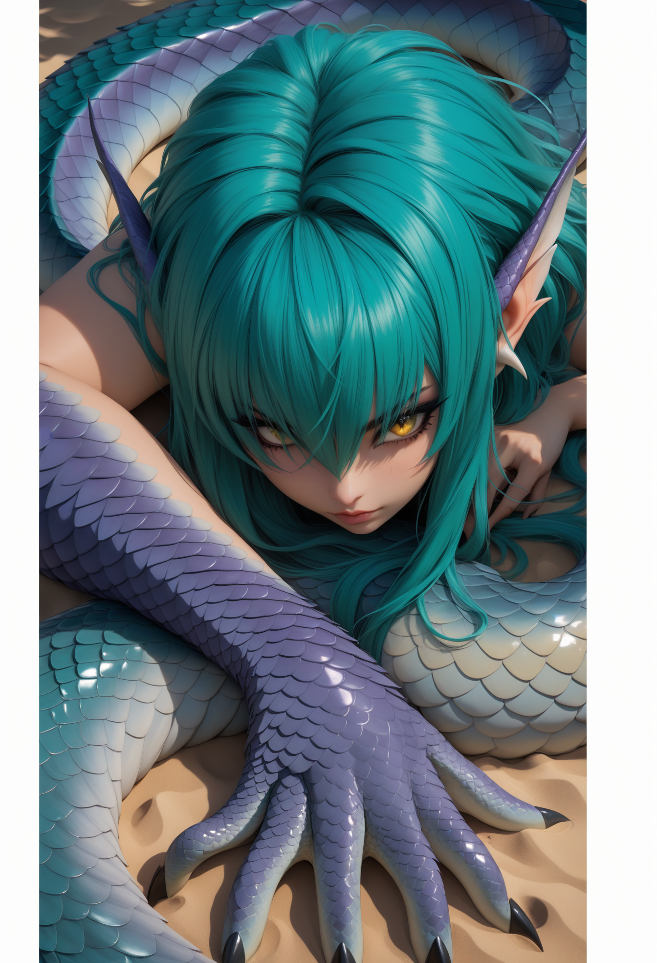 lazypos, SmoothNoob_Quality, Smooth Quality, HDR, raytracing, pathtracing, 3d render, realistic skin, realistic textures, detailed skin, masterpiece, best quality, absurdres, amazing quality, 8K, focused subject, (impossible clothing), ((sexy)), perfect breasts, (pretty face), (cute girl), (cute), <lora:frostbitev2_Illu_dwnsty:0.4>, frostbite, <lora:PowerPuffMixLora:0.7>, PowerPuffMixLora, A digital illustration shoot from a close-up angle about a character with green hair and dragon-like features, resting on a sandy surface with a serene expression. the image also shows scales on the body of the character and a focus on the character's face and hands. on the middle of the image, a woman appears to be in her early twenties, with long, wavy, teal hair and pointed ears. she has a serious expression and is looking down, with her closed mouth and closed eyes. her body is slim, and she is wearing no clothing. she is positioned in the center of the frame, with a large, purple snake coiled around her, its scales glistening in the soft, warm light. the background is a simple, sandy surface, and the overall color palette is vibrant with shades of blue, green, and purple. solo, 1girl, scales, hair over one eye, looking at viewer, fins, tail, green hair, monster girl, rating:sensitive, closed mouth, yellow eyes, head fins, fingernails, monster boy, lying, aqua hair, pointy ears, on stomach, rating:general, black nails, slit pupils, <lora:incoth:.2>, incoth, (incase:0.2),