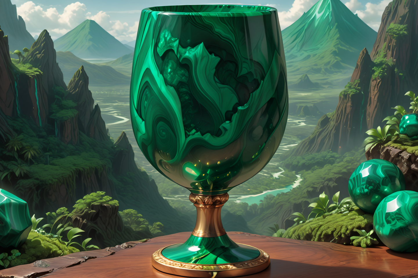 masterpiece, best quality, (ultra-detailed:1.3), (high resolution:1.2), (sharp focus:1.2), (clean lines:1.1), perfect anatomy, (intricate details:1.2), extremely detailed, realistic, style, crystal goblet with liquid solo, volcano, detailed background, gentle glow, close-up shot, <lora:Malachite_Style_SDXL:1>, malachite_style