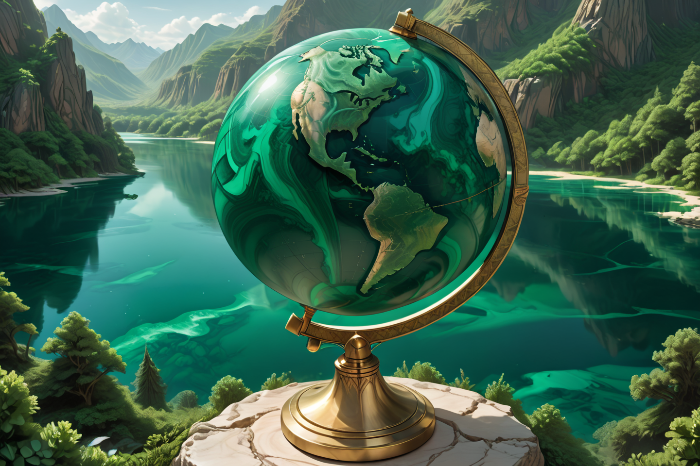 masterpiece, best quality, (ultra-detailed:1.3), (high resolution:1.2), (sharp focus:1.2), (clean lines:1.1), perfect anatomy, (intricate details:1.2), extremely detailed, realistic, style, globe, lake, detailed background, <lora:Malachite_Style_SDXL:1>, malachite_style