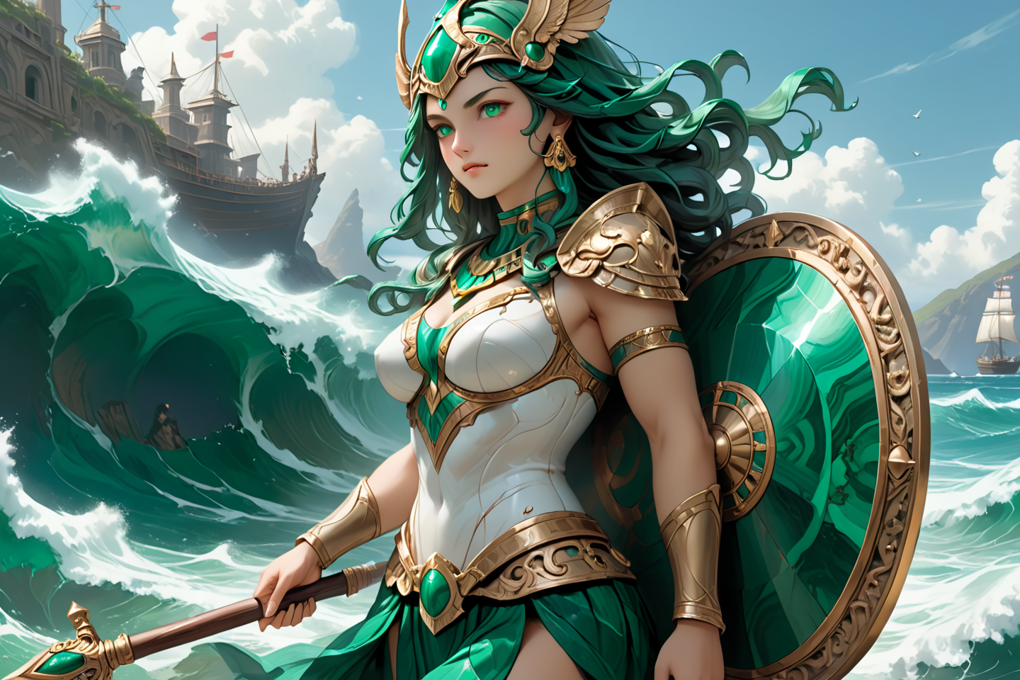 masterpiece, best quality, (ultra-detailed:1.3), (high resolution:1.2), (sharp focus:1.2), (clean lines:1.1), perfect anatomy, (intricate details:1.2), extremely detailed, realistic, style, , Minerve, goddess of wisdom, with a shield, wearing a silver helmet, shielding with a shield, solo, Ithacan coast with crashing waves, wooden ships, detailed background, standing, looking forward, mystical, glowing eyes, dynamic angle, wide shot, bright light, overhead shot, <lora:Malachite_Style_SDXL:1>, malachite_style